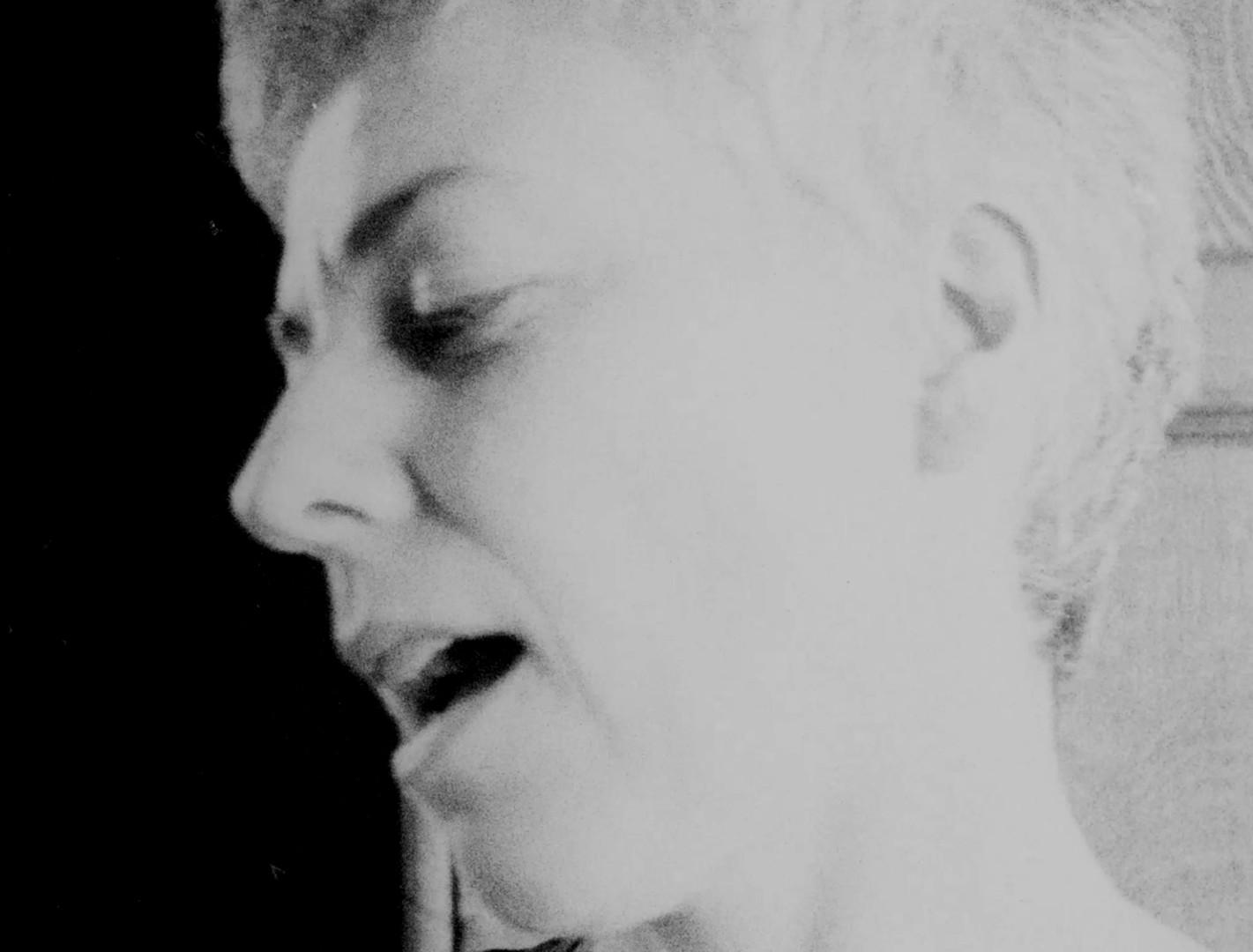A black and white film still of a white woman with short hair in front of a black background. She is shown in profile and the image is cropped in close, filling most of the frame.